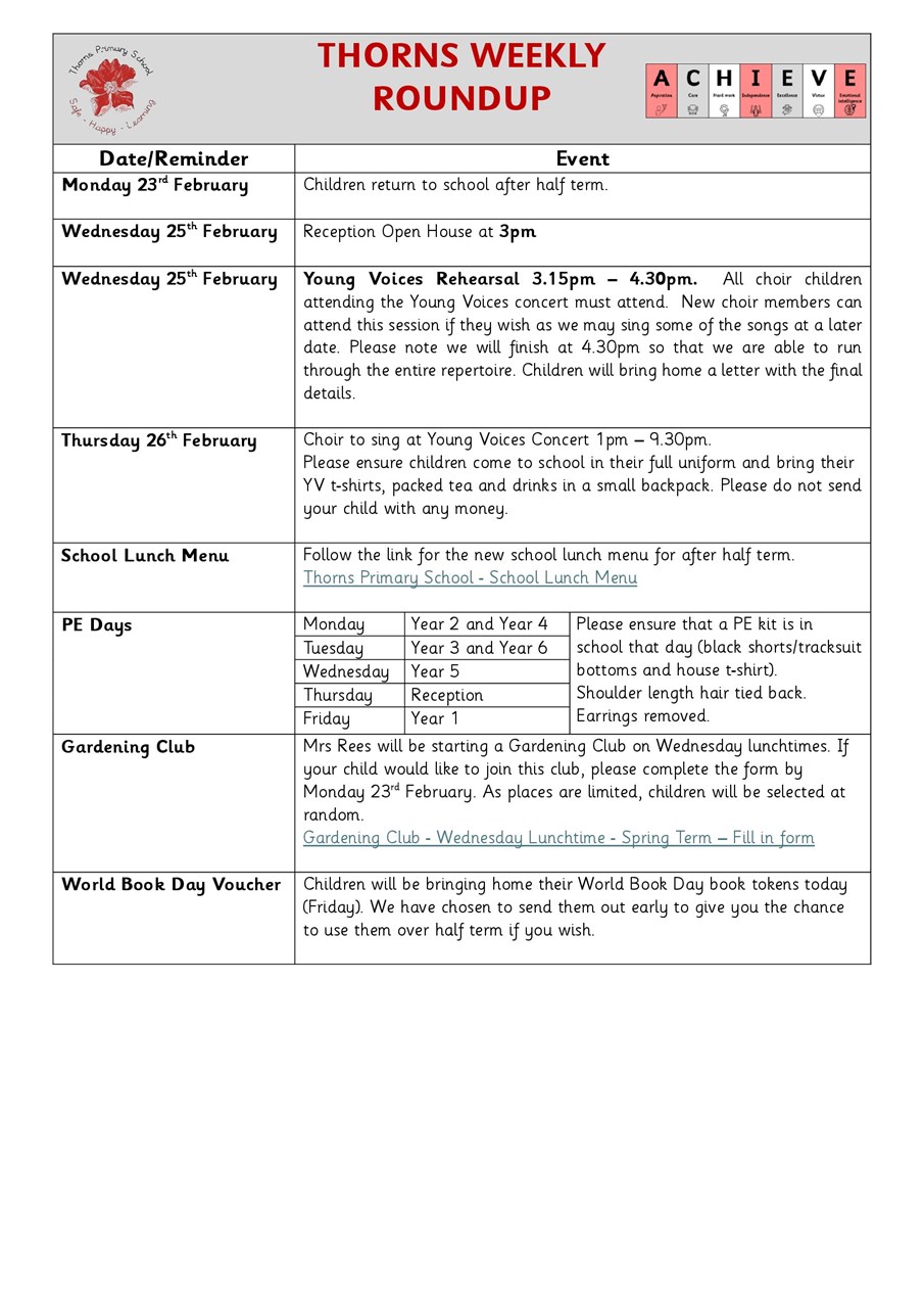 PE - Monday Y2&4 ; Tuesday Y3&6 ; Wednesday Y5 ; Thursday Reception ; Friday Y1